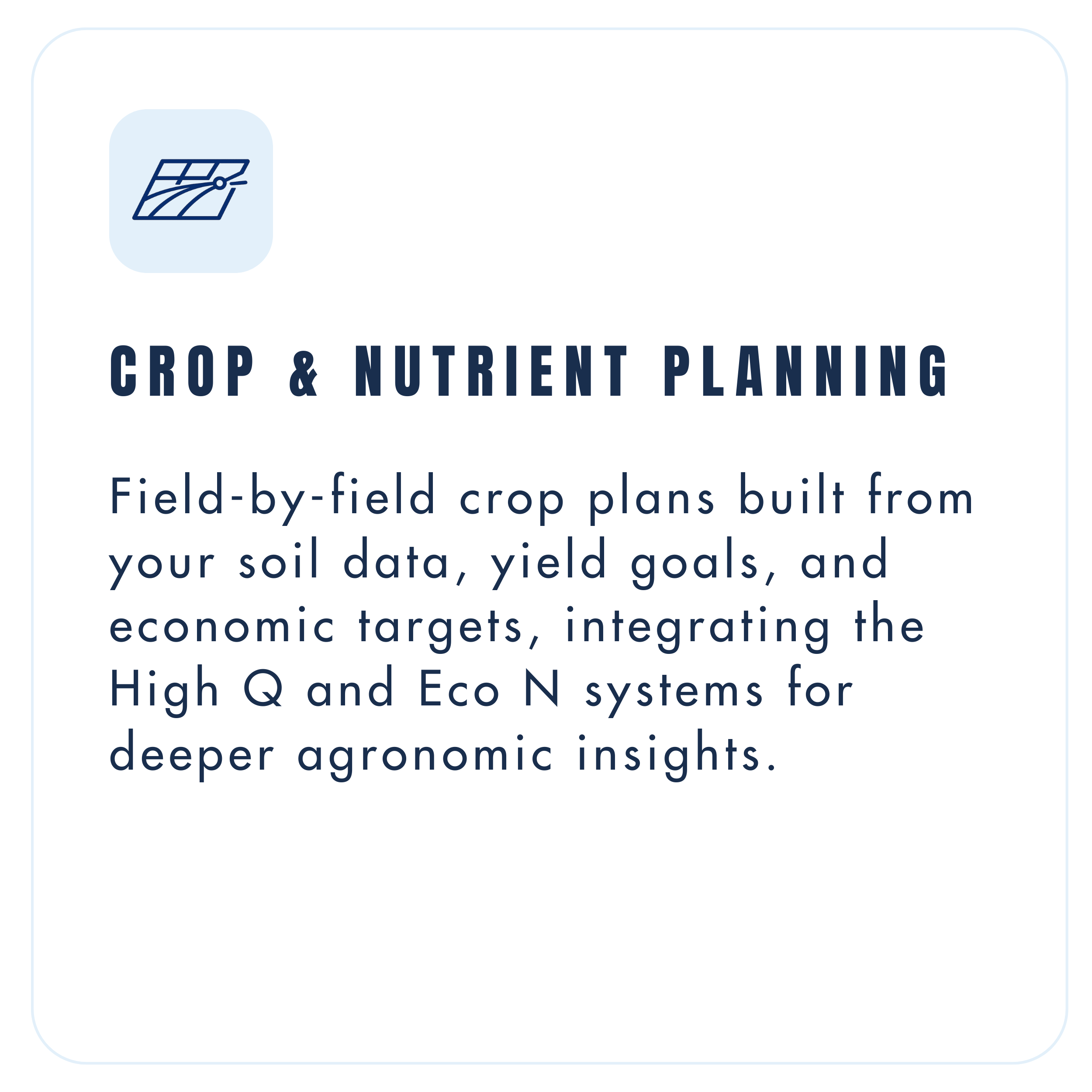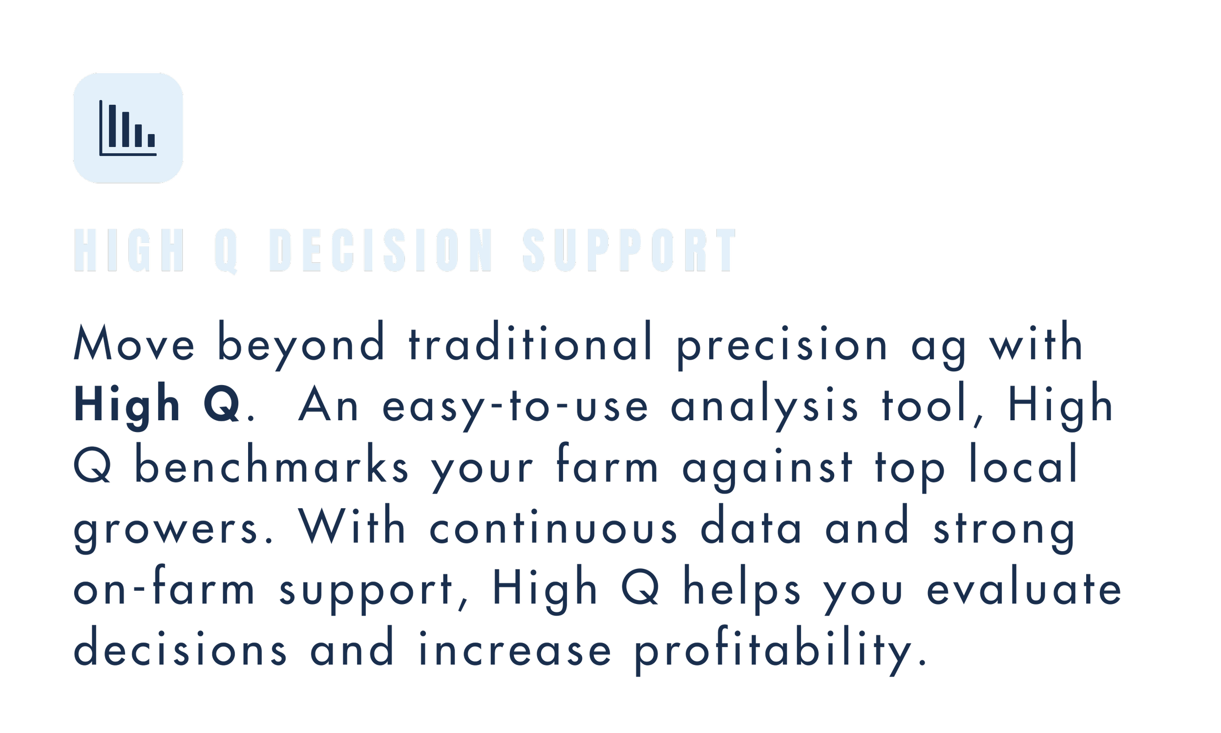 ← Back to Farm Performance System DECISION SUPPORT Access deeper agronomic insight for clearer, data-driven decisions. 01 Data Collection Soil testing, tissue sampling, and aerial insights that feed your system with accurate local data. 02 Modeling & Analysis High Q and Eco N transform field data into clear, economic and agronomic insight. 03 Field Execution Zone-specific planning and in-season surveillance that drive measurable results. ↑ Back to Overview DATA COLLECTION ↑ Back to Overview MODELING & ANALYSIS FIELD EXECUTION ↑ Back to Overview ✓ INTEGRATED SYSTEM✓ LOCAL DATA✓SMARTER DECISIONS Get Started